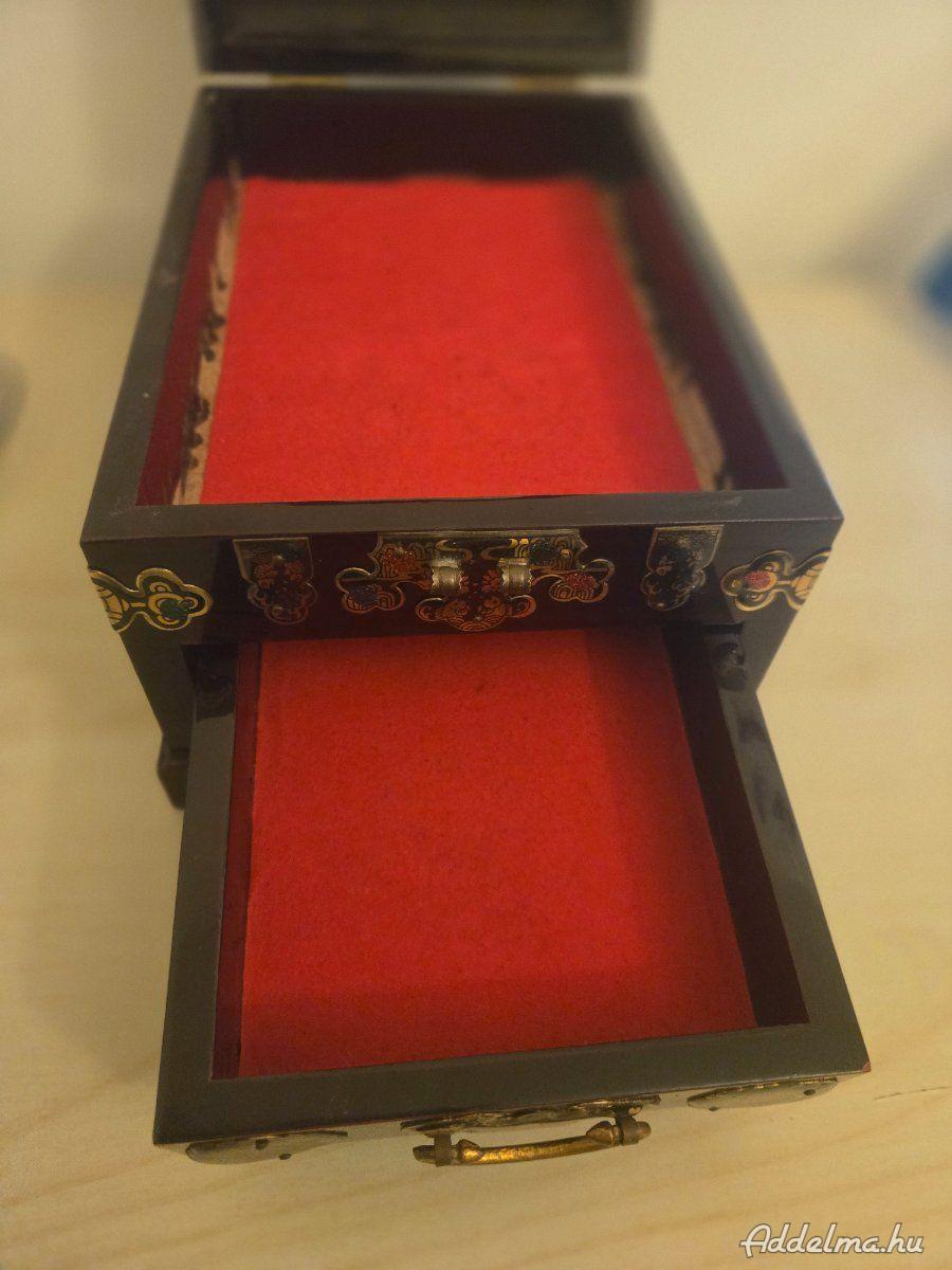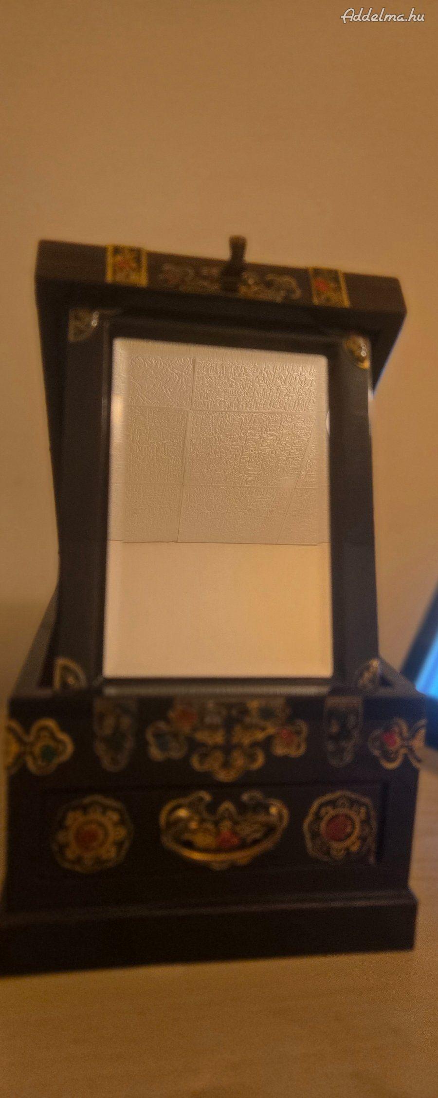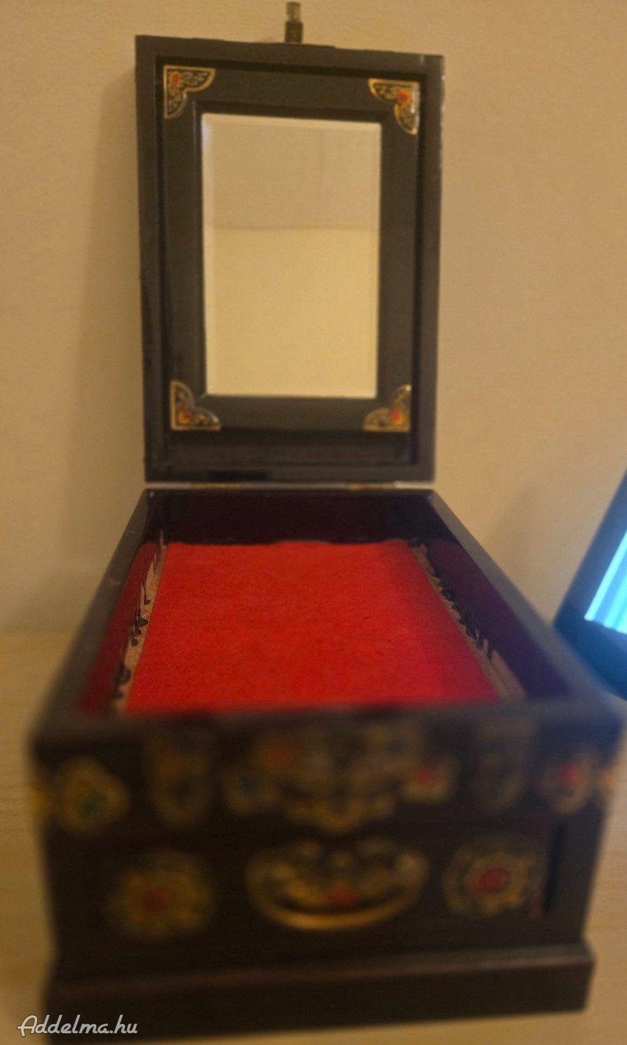Vintage stílusú keleties lakk sminkdoboz tükörrel,használható ékszeres doboznak is, vörös bársonnyal van bélelve a doboz belső része.
