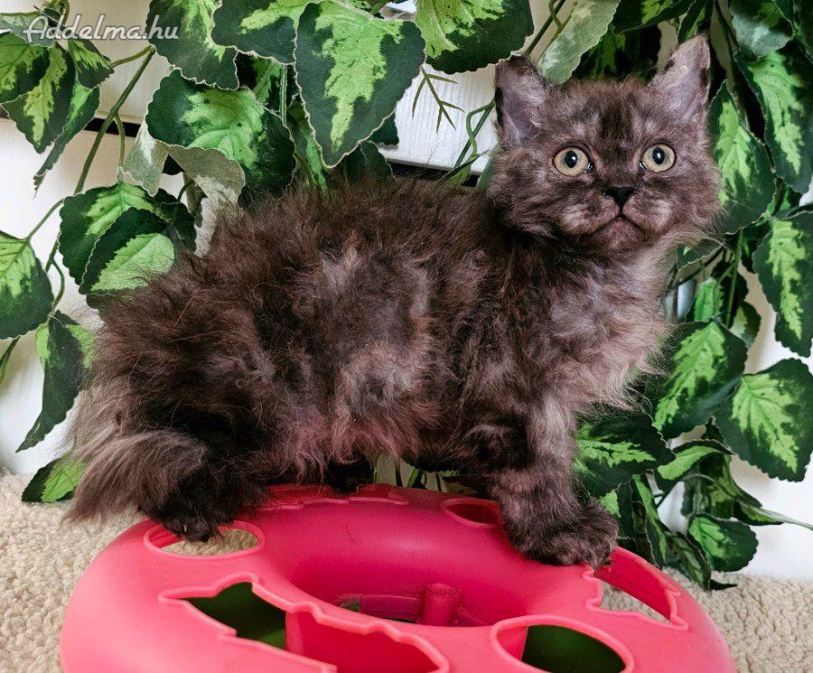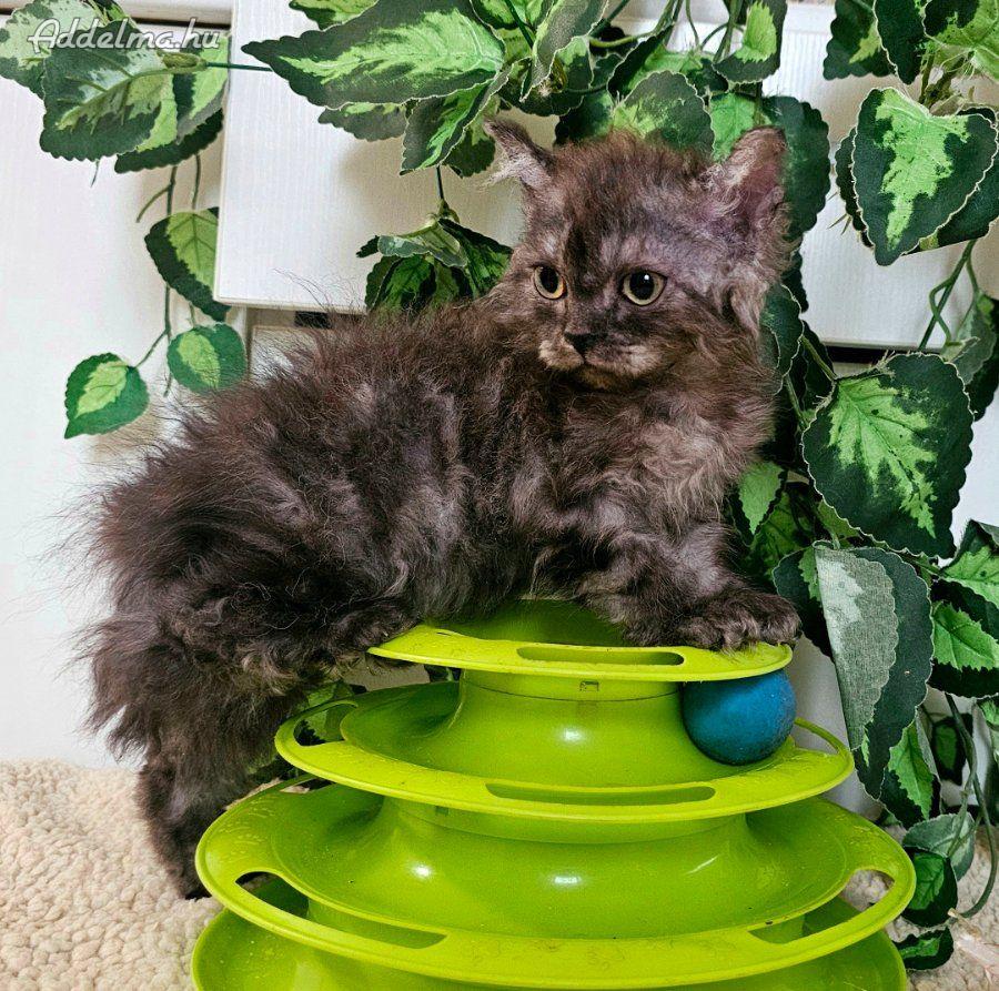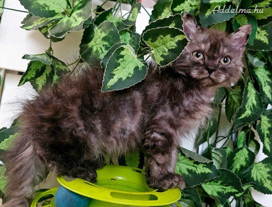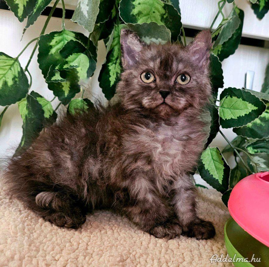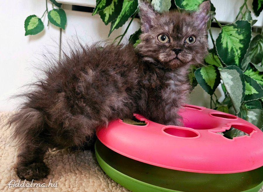 Eladó egy gyönyörű black smok Selkirk Rex hosszú göndör szőrű kislány cica a Selkirk King tenyészetből, 2025.08.18.-án született.