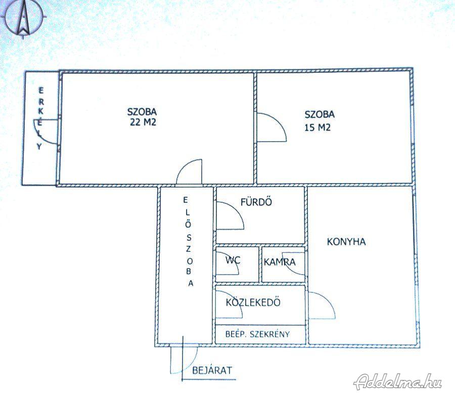 Az ingatlanban, előszoba, 2 tágas parkettázott szoba, közlekedő, beépített szekrénnyel, konyha, kamra, külön zuhanykabinos fürdőszoba, WC található.