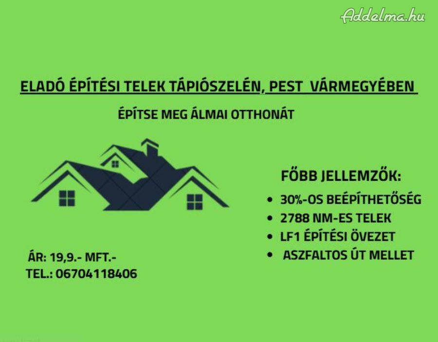 Pest vármegyei Tápiószelén eladó belterületi építési telek, társasház, családi ház vagy ikerház megvalósítására alkalmas.