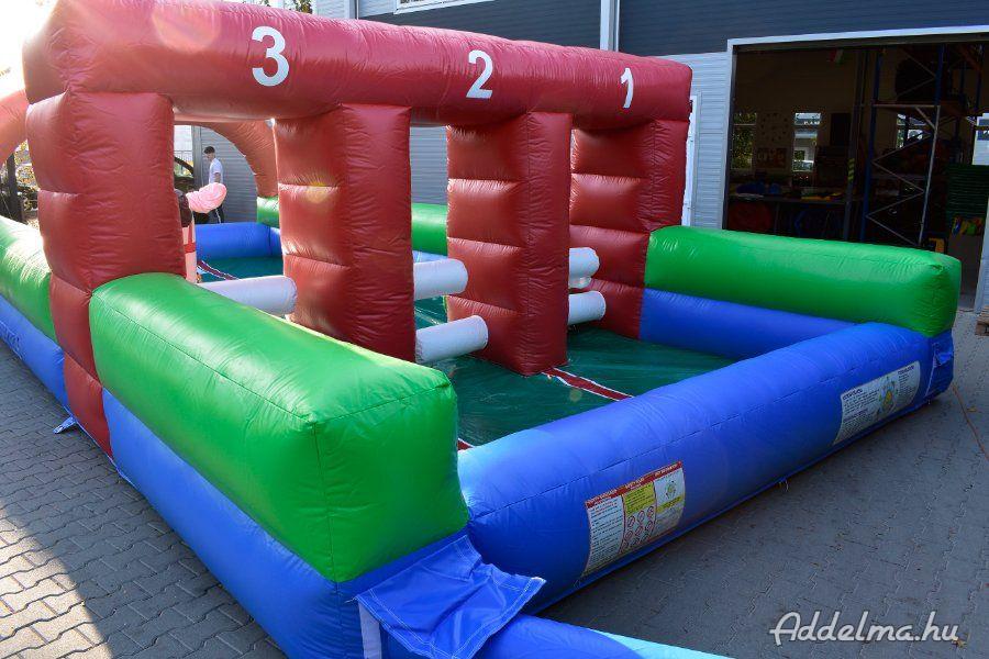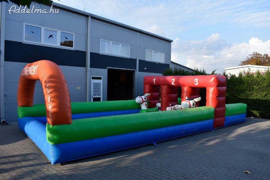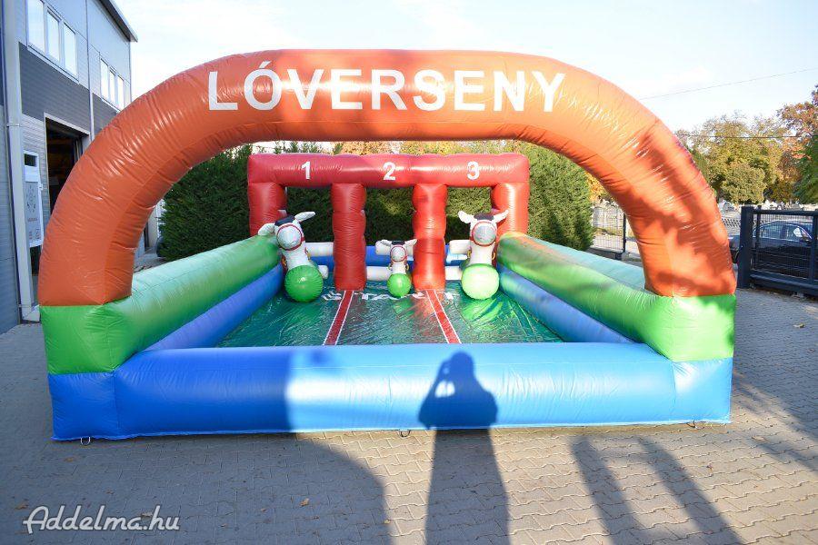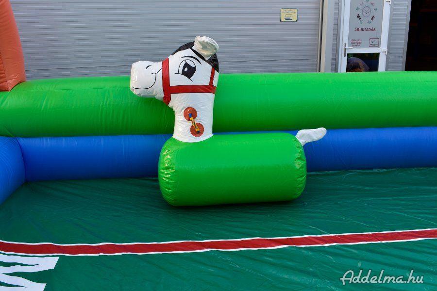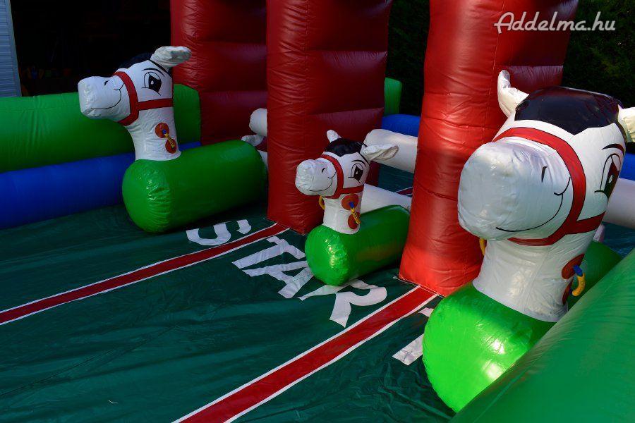 Tartozékok: befúvó motor, rögzítő vascövekek, műszaki vizsga, (érvényessége: 2028.04.15.), felfújható lovacskák (3db gyermek + 3db felnőtt), pumpa a lovacskák felfújásához, javító készlet