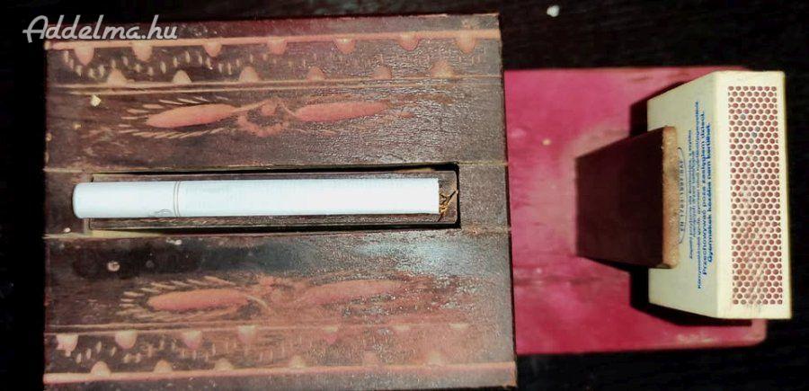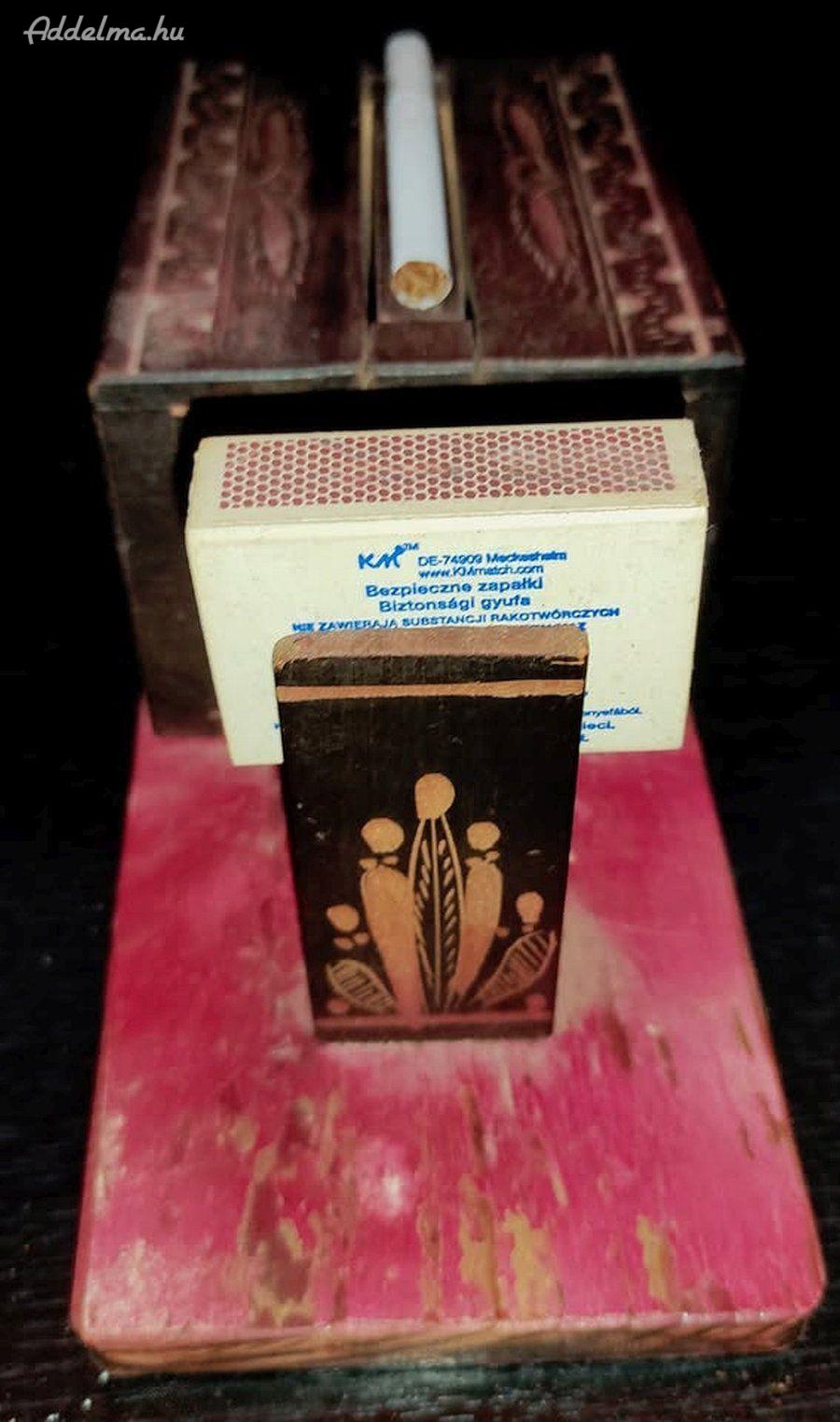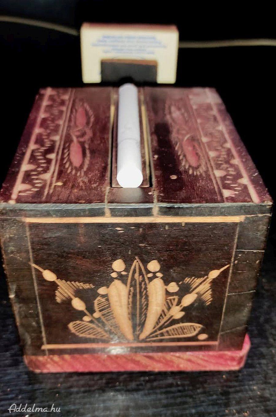 Különböző faragásokkal díszített fa cigaretta adagoló eladó! Korához illő festék kopásokkal. Gyűjtőknek, restaurálni szeretőknek kötelező darab lehet.