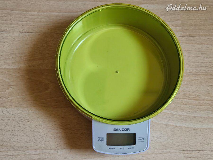 *Sencor SKS 4004GR digitális elemes konyhamérleg: Működik, hibája csupán annyi hogy az elem fedél lejár, és a tálka belül egy helyen enyhén foltos. Kivehető zöld színű 1L-es tál, 1g-5kg-ig mér, tára funciós, 2db AAA elemmel üzemeltethető(nem tartozék), használati utasítás jár hozzá. Méret 18x22x73cm, anyaga ABS.