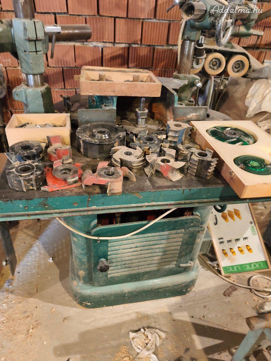 Öntvényházas asztalmaró kitámasztó tengellyel és előtolóval + 15 marófejjel.