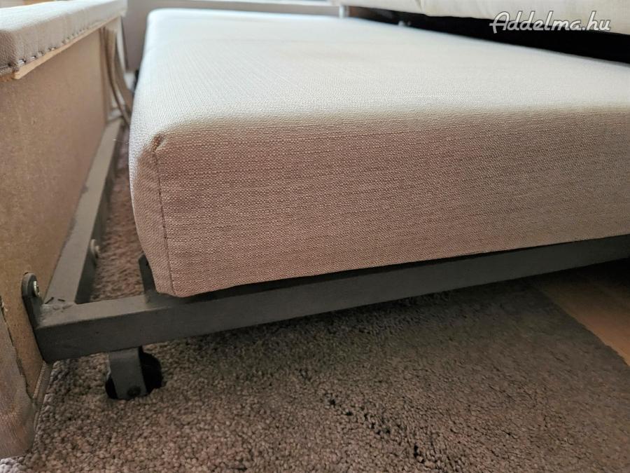 A kanapé nem új, használatból eredő hibái vannak: ajánlott egy kárpit tisztítás vagy csere (a képen látható kisebb szakadás miatt, ami a kihúzható ágyrészen található és összecsukva nem látható, a használatot nem befolyásolja), és egy törött/javitattható hullámrugó cseréje, ezért ennyi az ára. (eredeti ára 240e volt)
