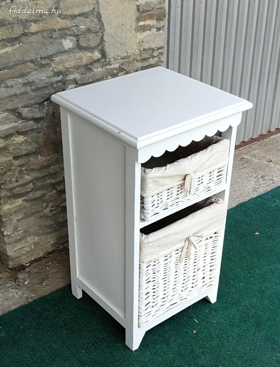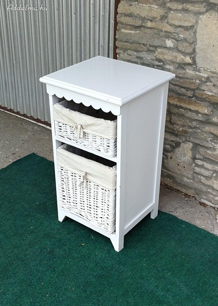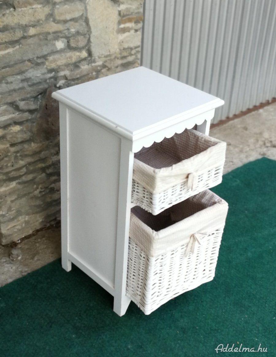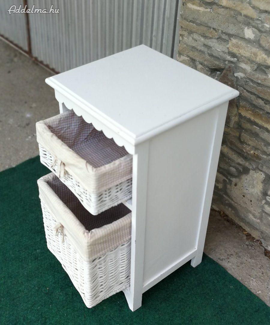 Fehér színű fából készült kis szekrény , két fiókkal eladó a képen látható állapotban.