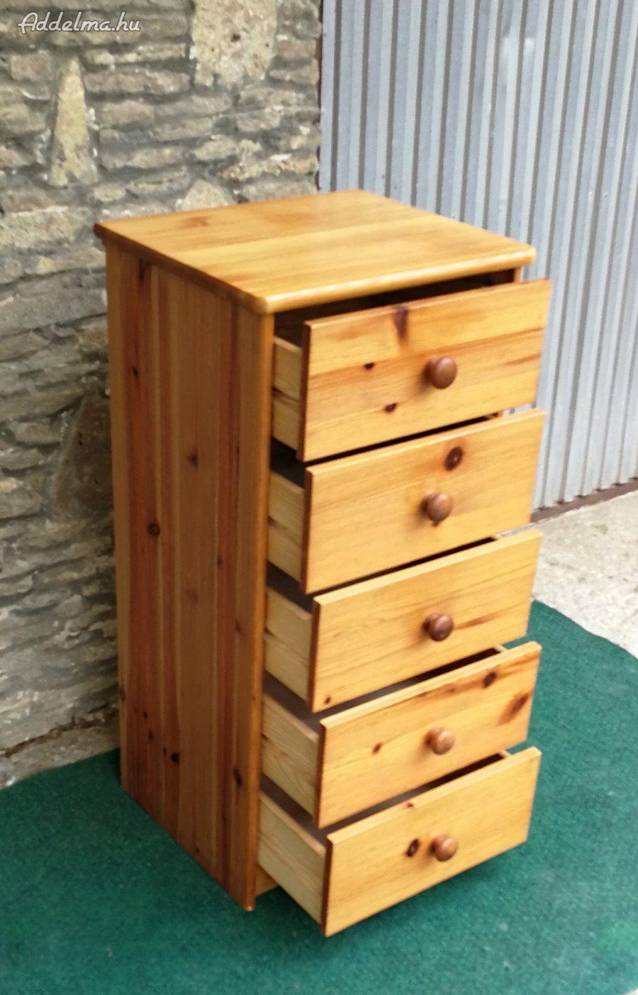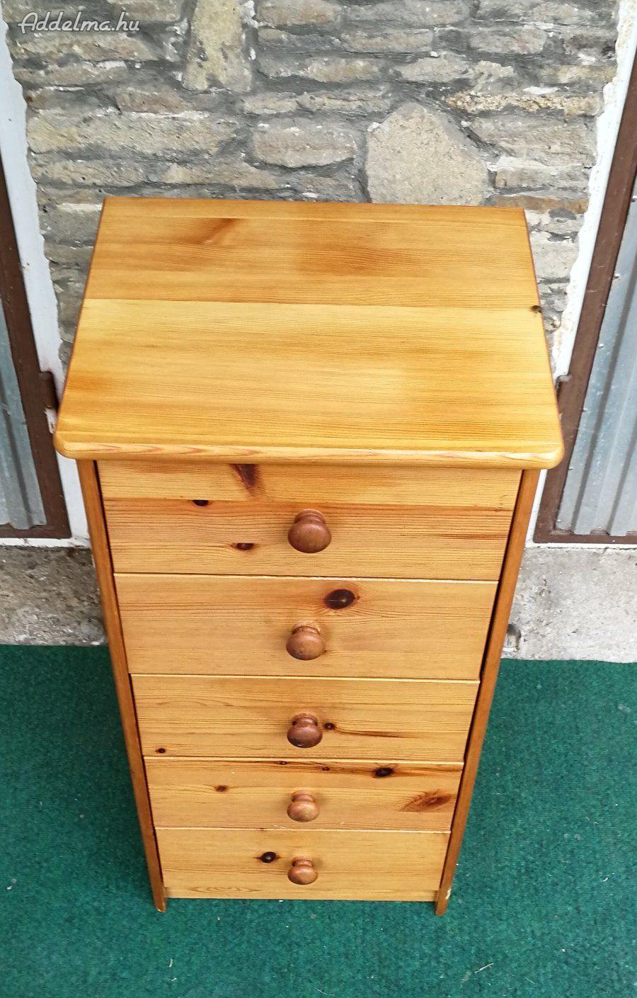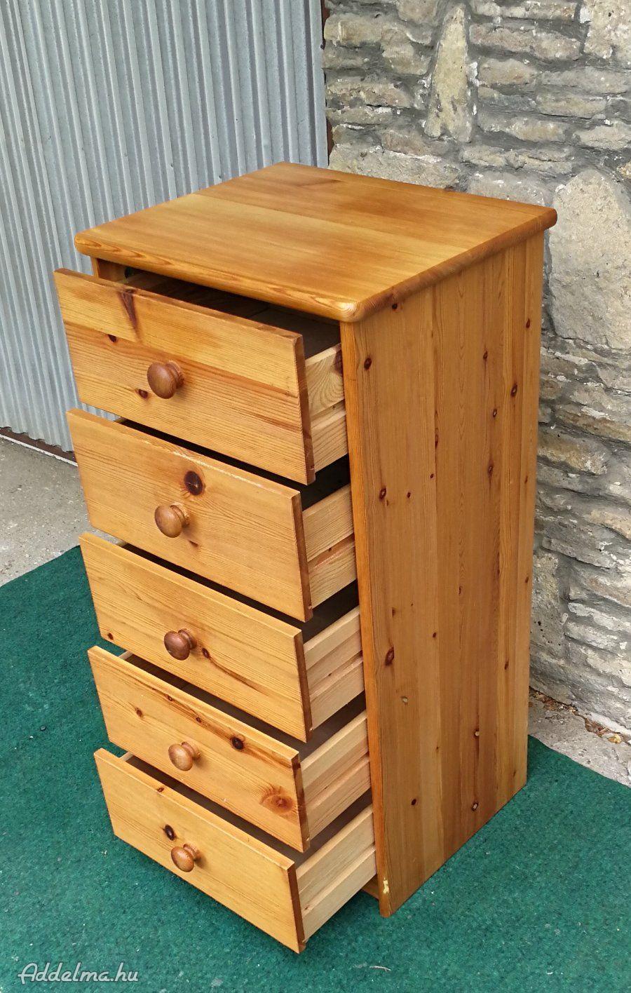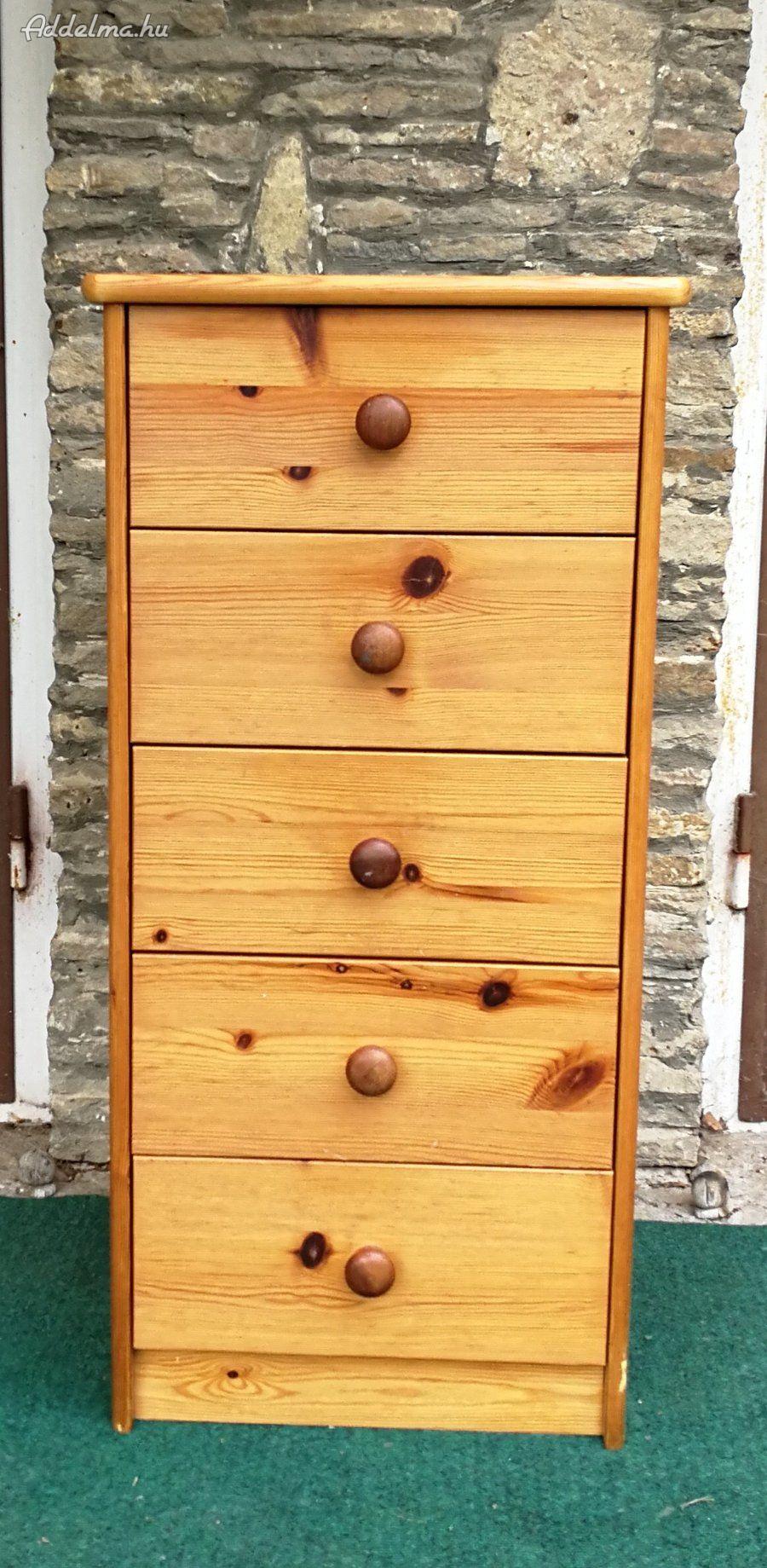 Fenyőfából készült hosszú komód 5 fiókkal, apró használati nyomokkal eladó a képen látható állapotban.