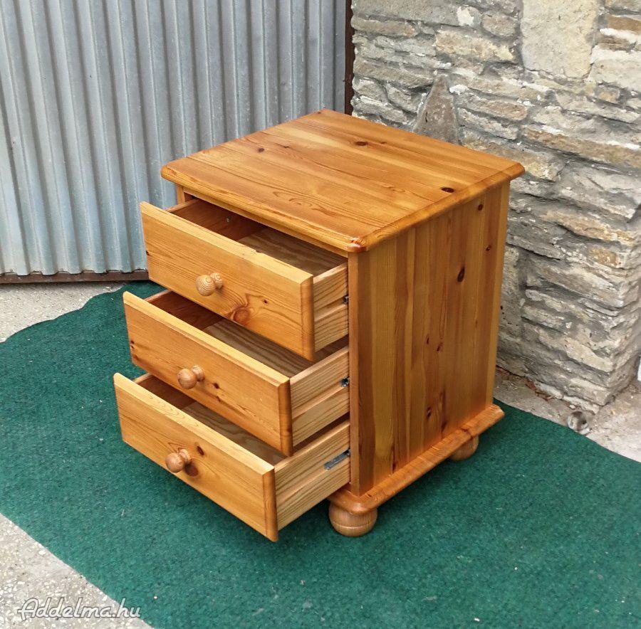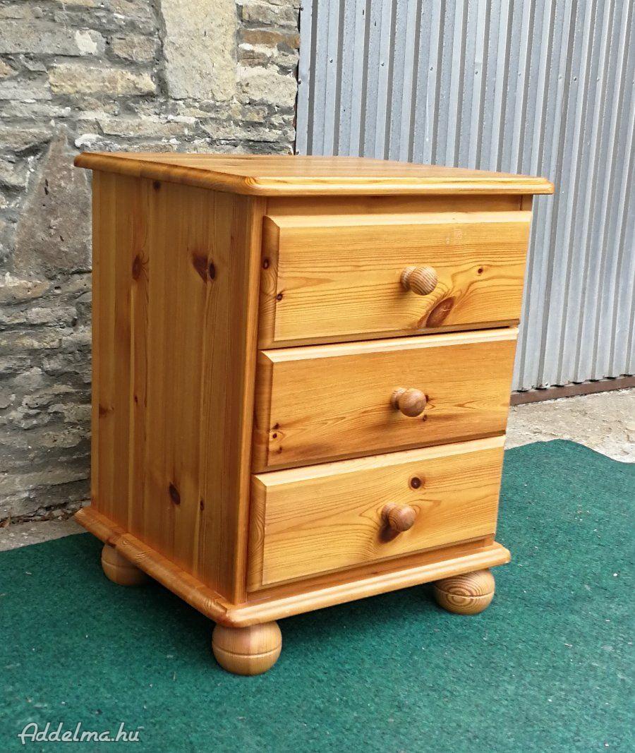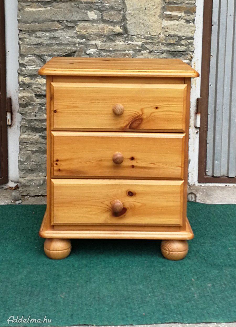 Jó állapotban lévő fenyőfából készült éjjeliszekrény, 3 fiókkal, pogácsa lábakkal eladó.