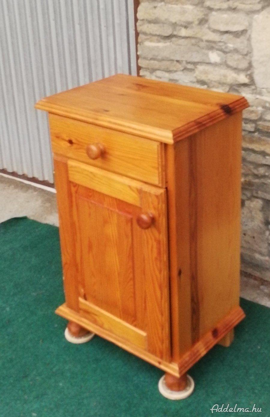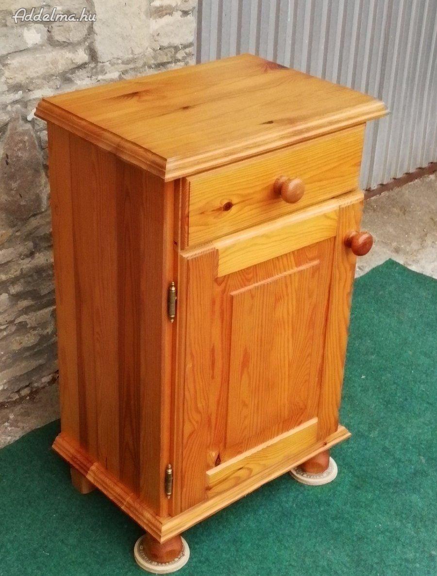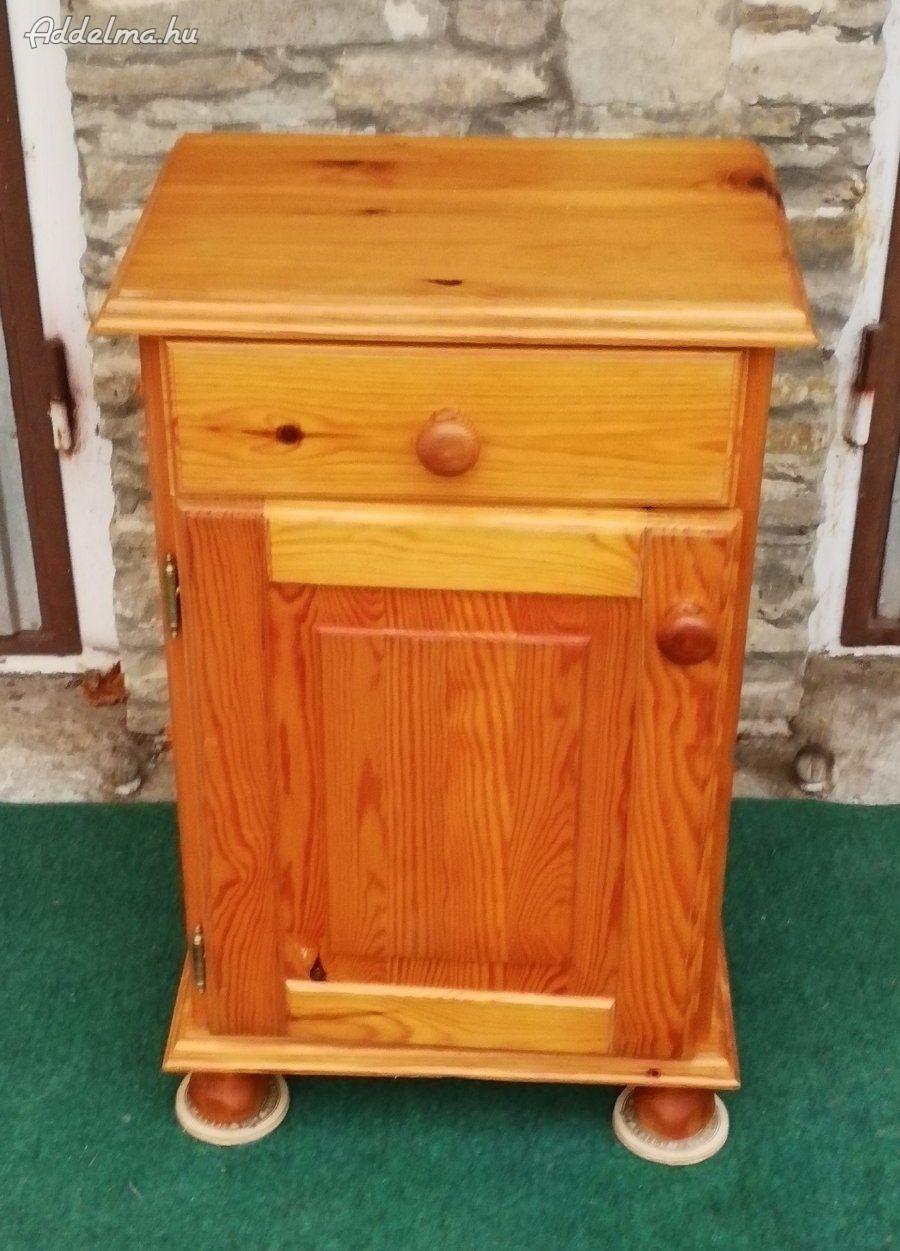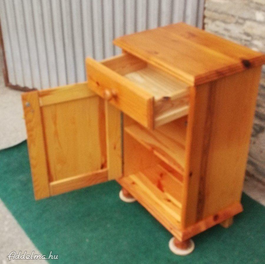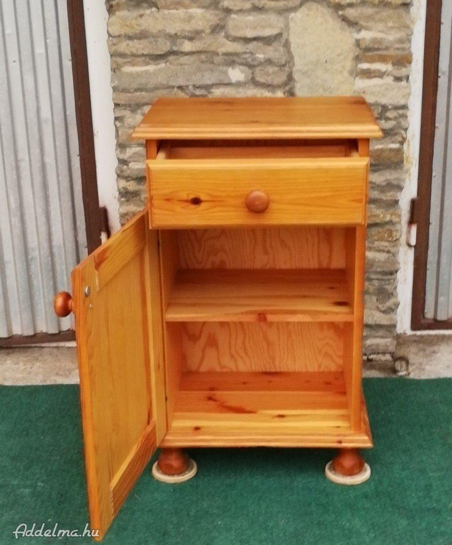Egy fiókos, kis ajtós fenyőfából készült éjjeliszekrény, eladó a képen látható jó állapotban.