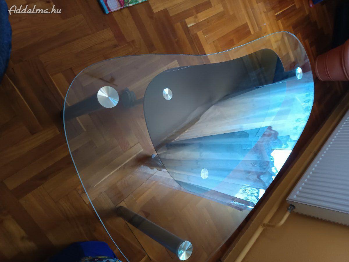 A dohányzó asztal lábai szürke fém, a felsó lap ives, az alatta lévő gurulós rész fekete. Mérete: 120 cm hosszú, az iv legnagyobb része 70 cm. Ha felkeltette érdeklődését, akkor képet e- mail-ben tudok küldeni. A megadott ár alku képes.