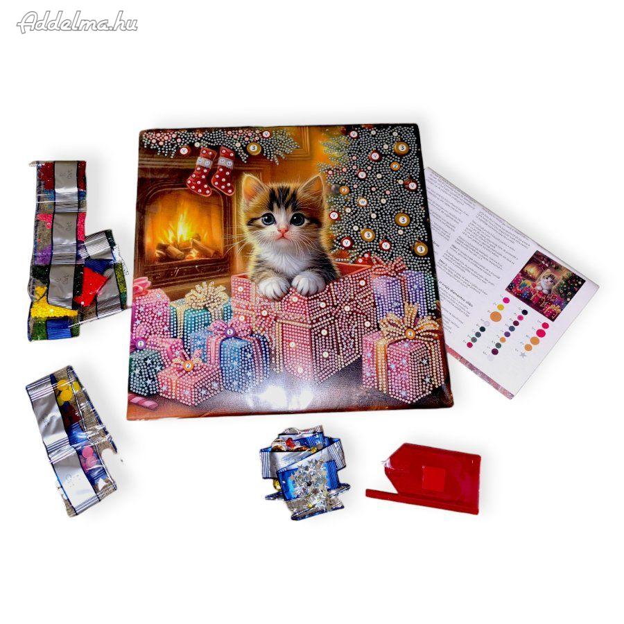 Cuki cicás karácsonyi gyémánt kirakó, amely ragyogó kövekkel és ünnepi hangulattal varázsolja el a kreatív pillanatokat. A kép kicsi és nagy csillogó gyémántkövekkel díszíthető, így minden alkotás egyedi és látványos eredményt ad.