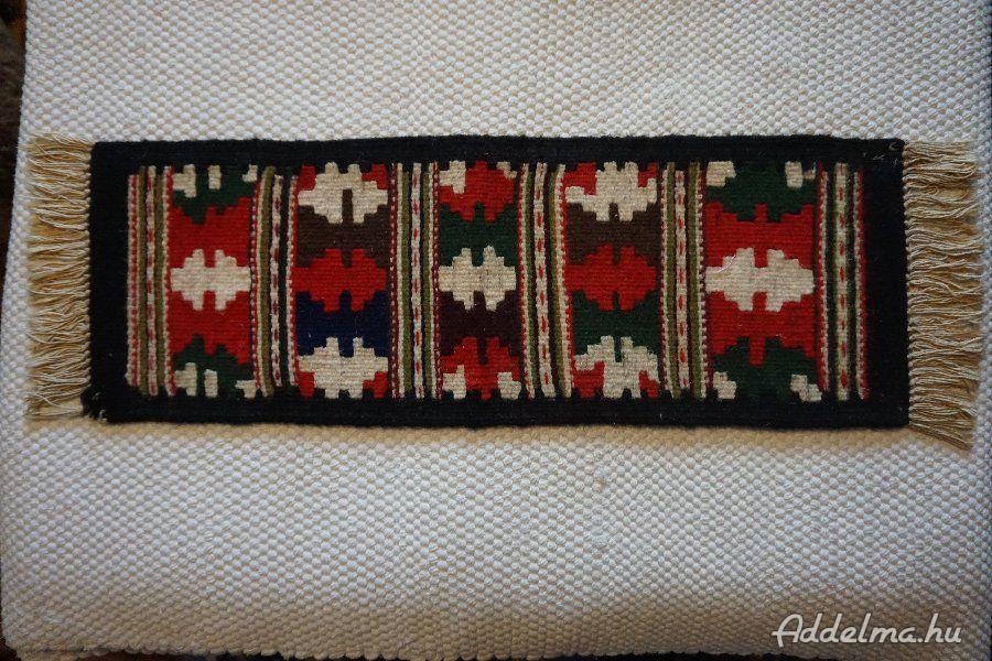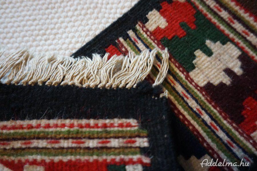 Piros-fehér- fekete csíkmintás, rojtos.Akár fürdőszobai kilépő szőnyegnek is alkalmas.Az egyik rojtja szálai kihúzódtak, kézi varrással javítható.