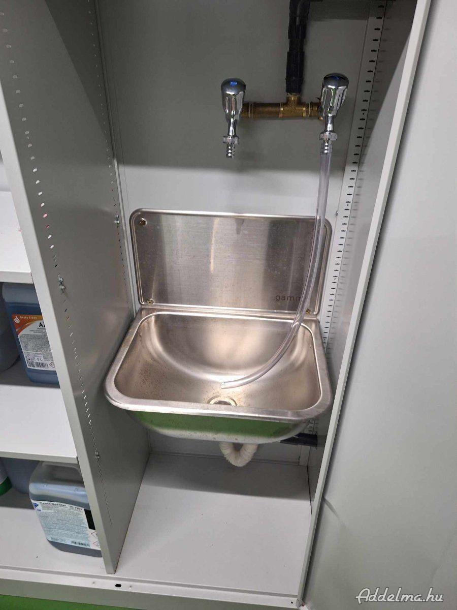 Kétajtós tároló szekrény polcokkal, de egy kézmosó is beépítésre került.